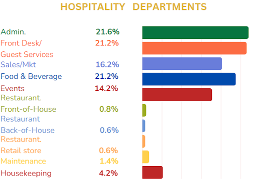 - 21.6% of participants work in an administrative role; 21.2% in front desk; 16.2% in sales and marketing; 21.2% in food and beverage; and the remaining participants are in events, housekeeping, restaurants, or maintenance.
